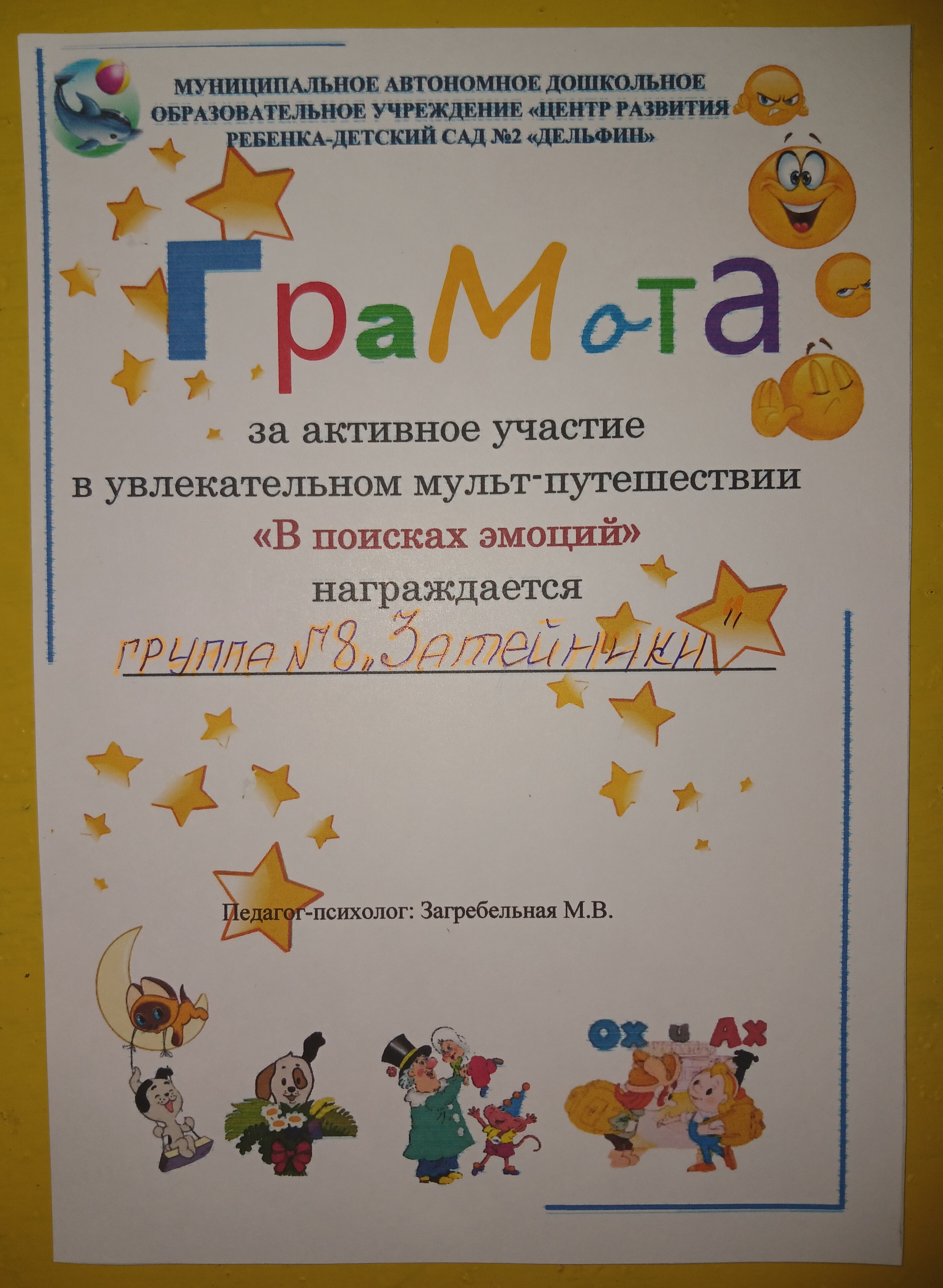 Грамота группе √8 "Затейники"за активное участие в мульт - путешествии "В поисках эмоций" 1 декабря 2025г.
