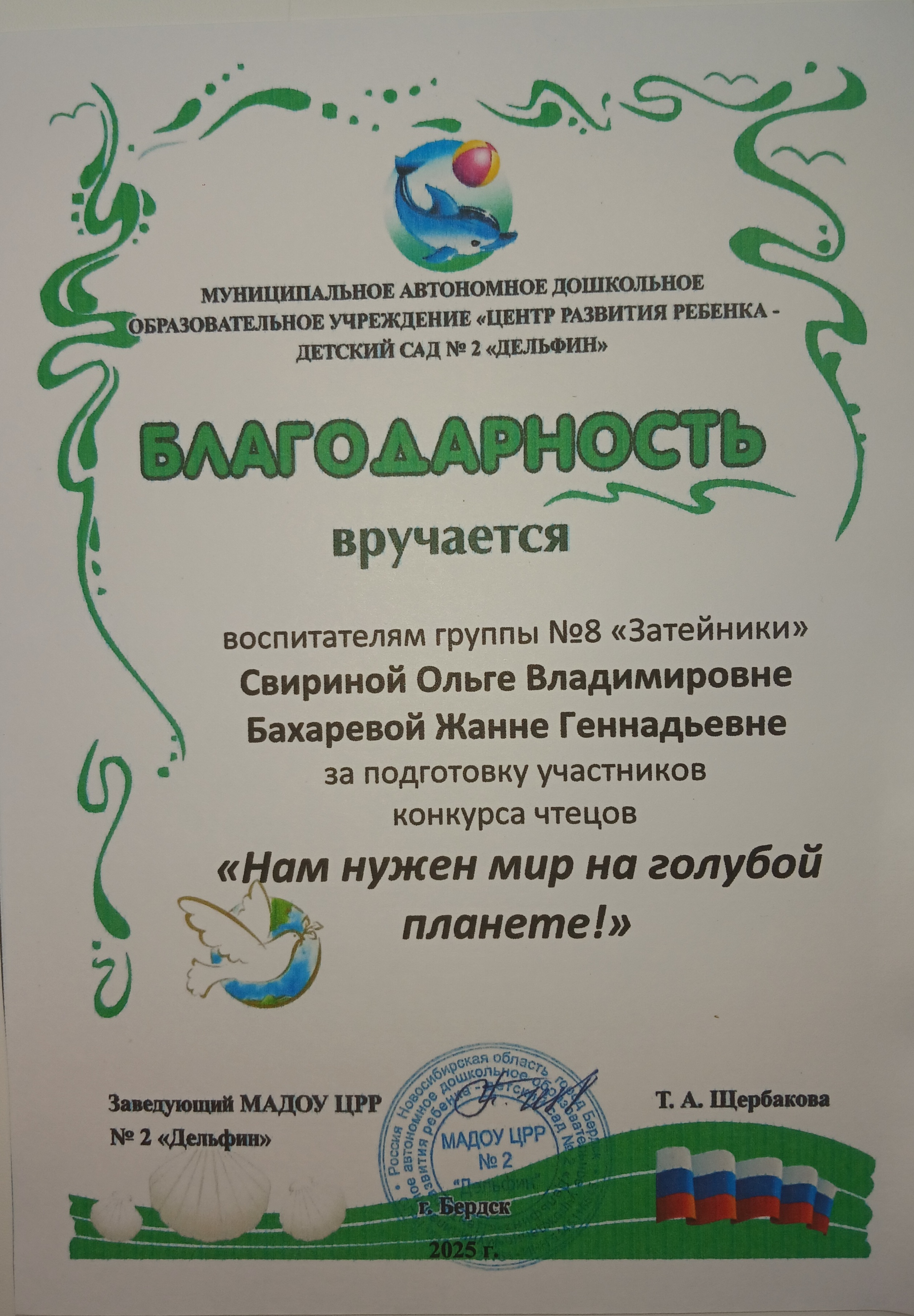 Благодарность за подготовку участников конкурса чтецов. "Нам нужен мир на голубой планете!" 06.11.25г.