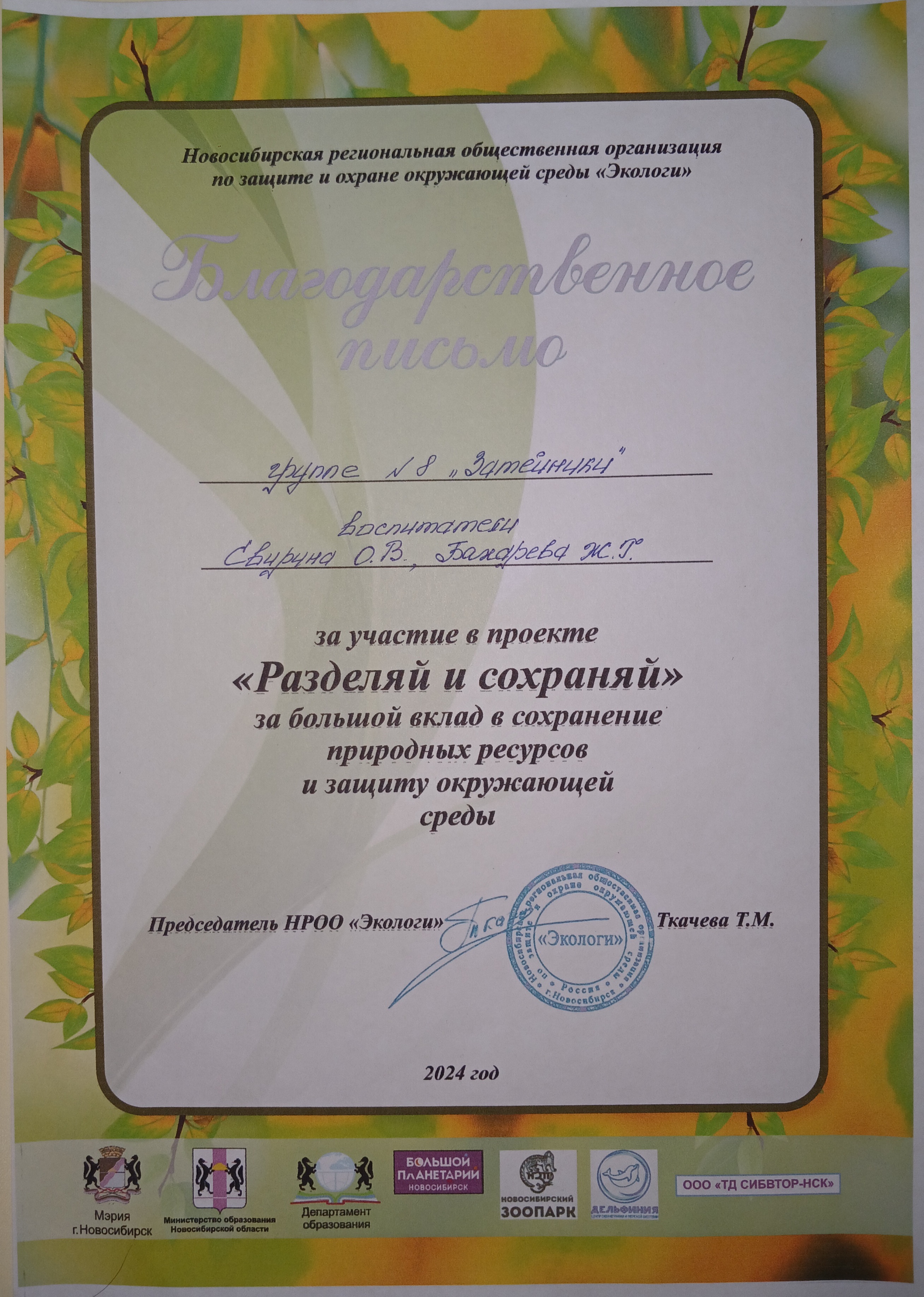 Благодарственное письмо за участие в проекте "Разделяй и сохраняй"