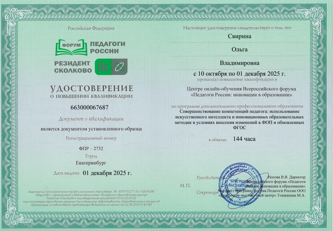Удостоверение о повышении квалификации. 144 часа. С 10 октября по 1 декабря 2025г.